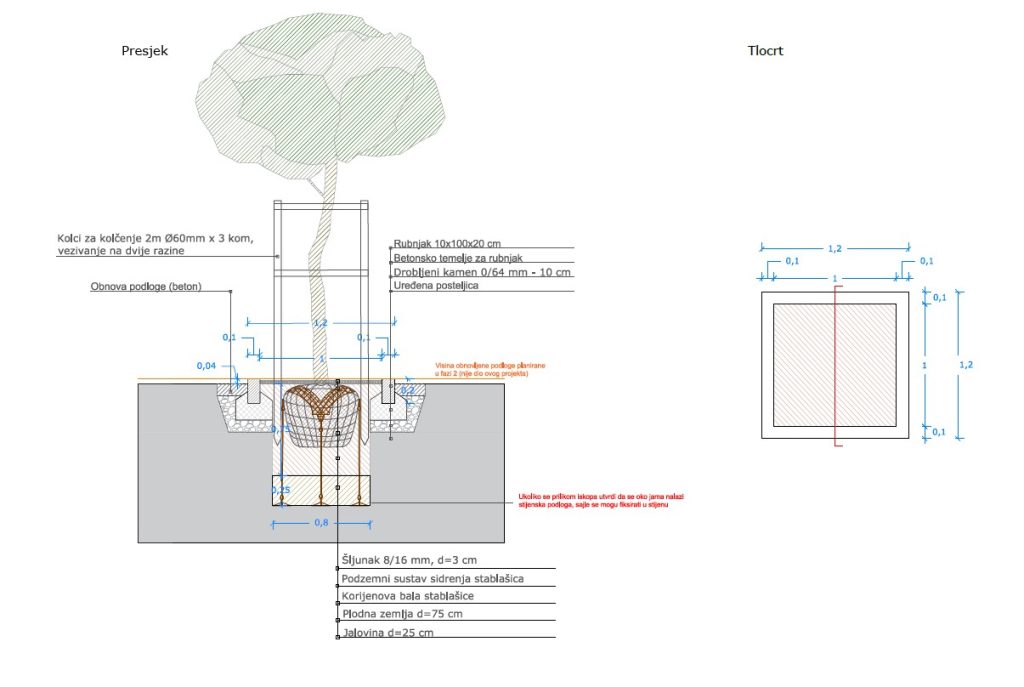 U kazete se sadi ukupno 35 stabala. Dimenzije otvora kazeta iznose 100 x 100 cm, a planira se njihovo omeđivanje rubnjacima širine 10 cm, zbog čega vanjske dimenzije iznose 120 x 120 cm. Dubina kazete planira se -100 cm od postojećeg terena prometne plohe. Dno kazete planira se u dimenzijama 80 x 80 cm. Razmak između kazeta iznosi oko 560 cm kako bi se osigurao uzdužni parking između stabala, dok razmak između stabala iznosi oko 680 cm (gledajući od središta debla do središta debla). Betonski rubnjak postavlja se uzdignut 4 cm u odnosu na postojeći teren, zbog obnove hodnih/promentih površina koje će se podignuti za 4 cm na cijeloj zoni obuhvata (obnova i podizanje površina nisu obuhvaćeni ovim projektom, već su dio zasebnog projekta koji se planira provesti u daljnjim fazama).
