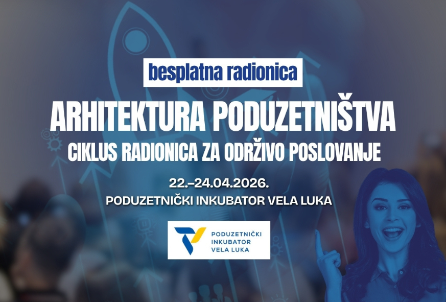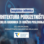 Poduzetnički inkubator Vela Luka poziva vas na ciklus besplatnih radionica “Arhitektura poduzetništva” koje će se održati u Veloj Luci od 22. do 24. travnja 2026.